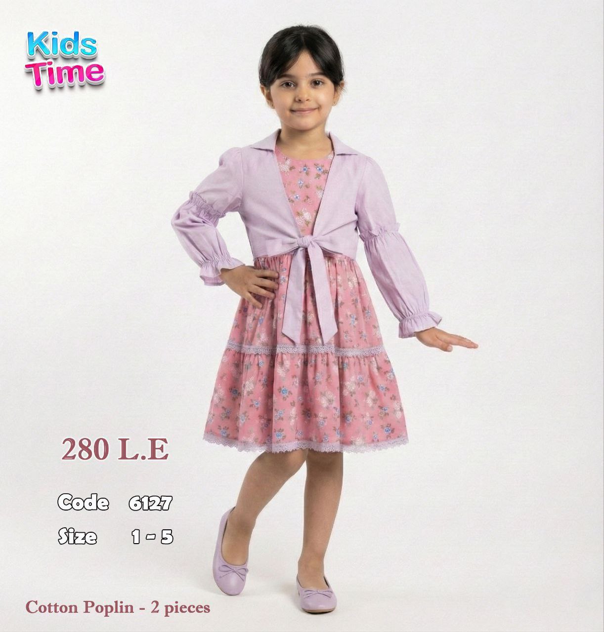 فستان أطفال من قطعتين مصنوع من بوبلين القطن بنقشة زهور جميلة، مع جاكيت أنيق بأكمام مزخرفة. مثالي للمناسبات والطلعات الخاصة.