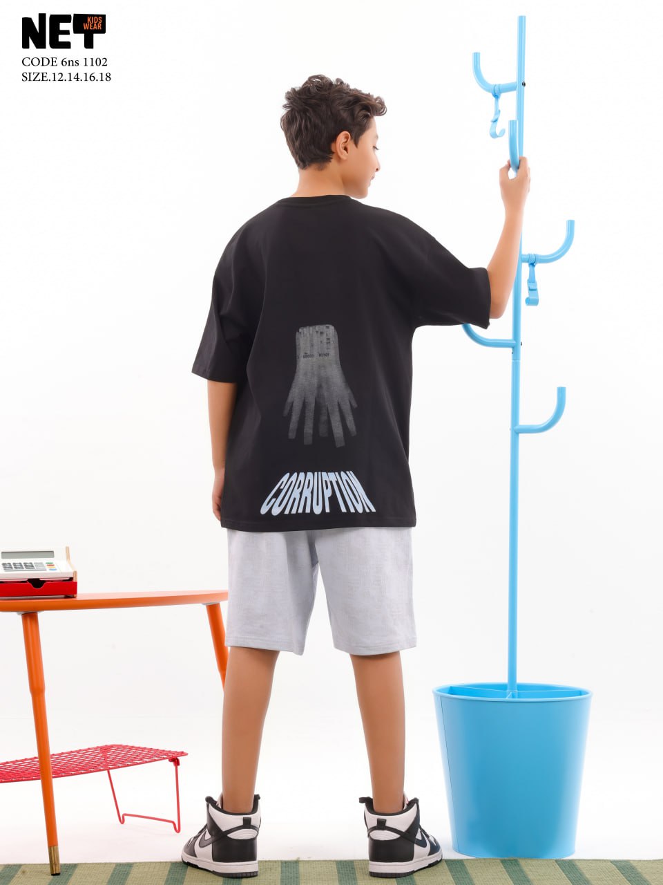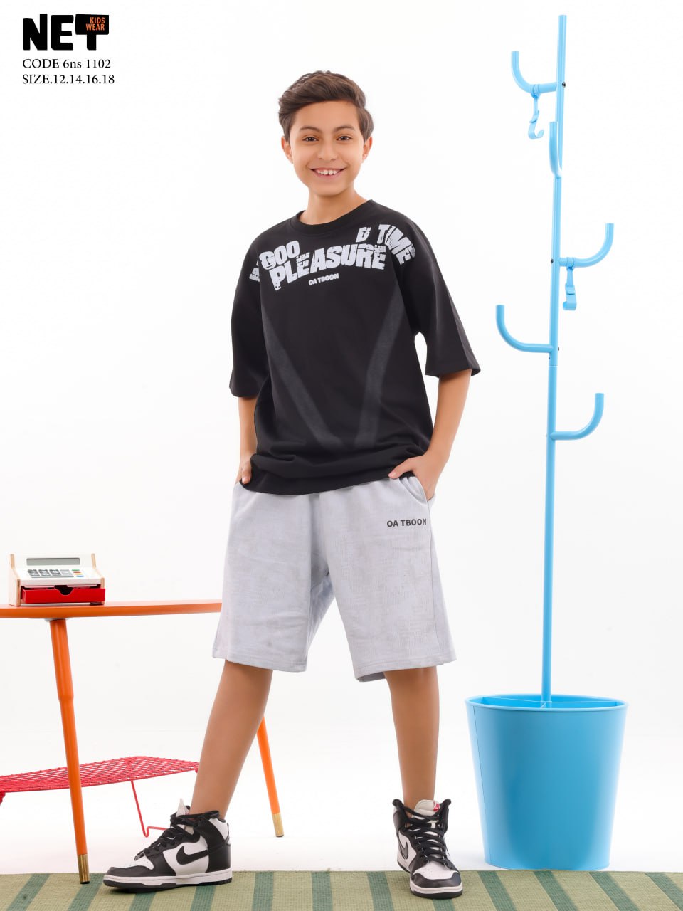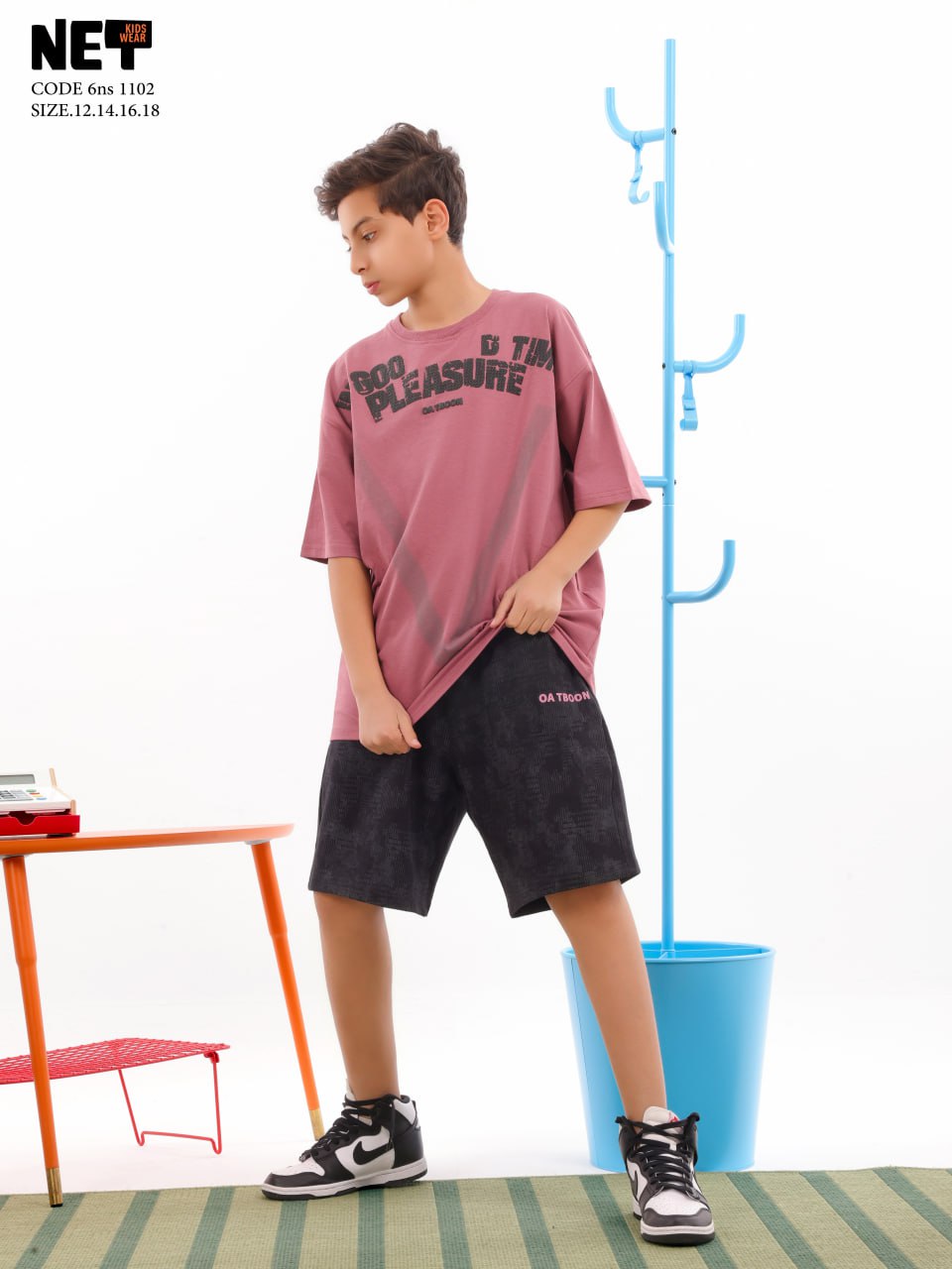 طقم أولادي عصري يتكون من شورت بخامة برسولا وتيشيرت ميلتون بدون قسطره. مثالي للمناسبات الكاجوال والأنشطة اليومية.