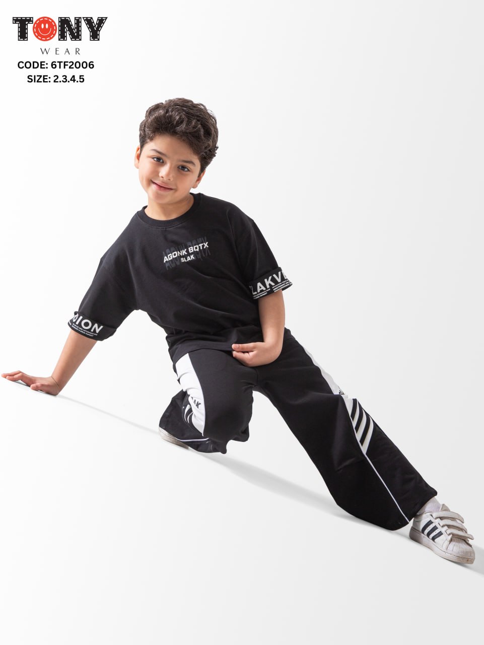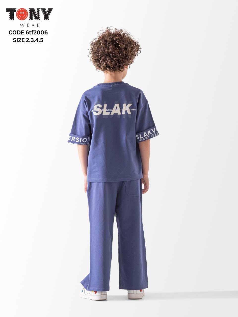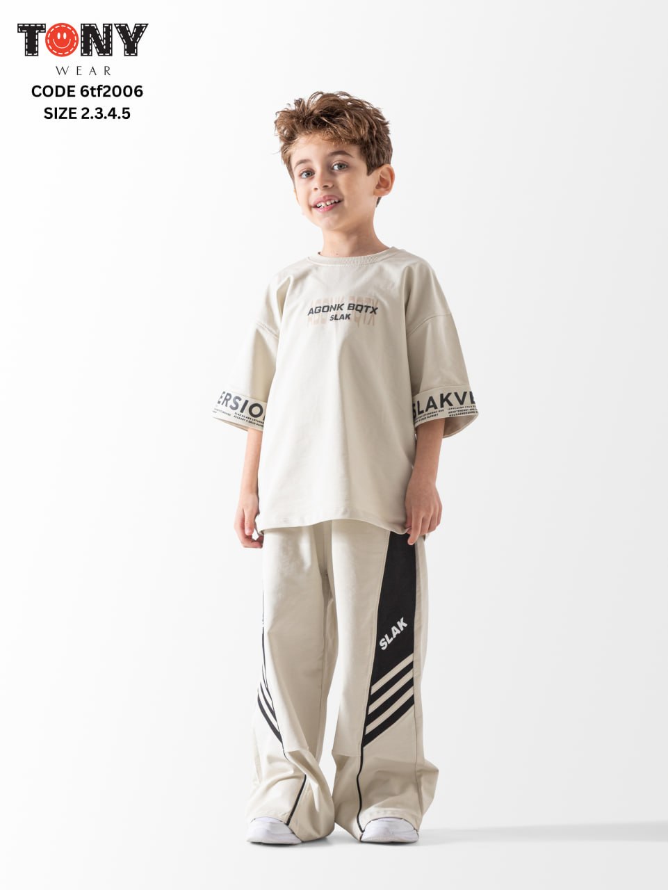 طقم أولادي مكون من تيشيرت وبنطلون مصنوع من قماش قطن سمر. التصميم مميز بشعارات على الأكمام والجوانب، مما يجعله مثالي للمناسبات الكاجوال.