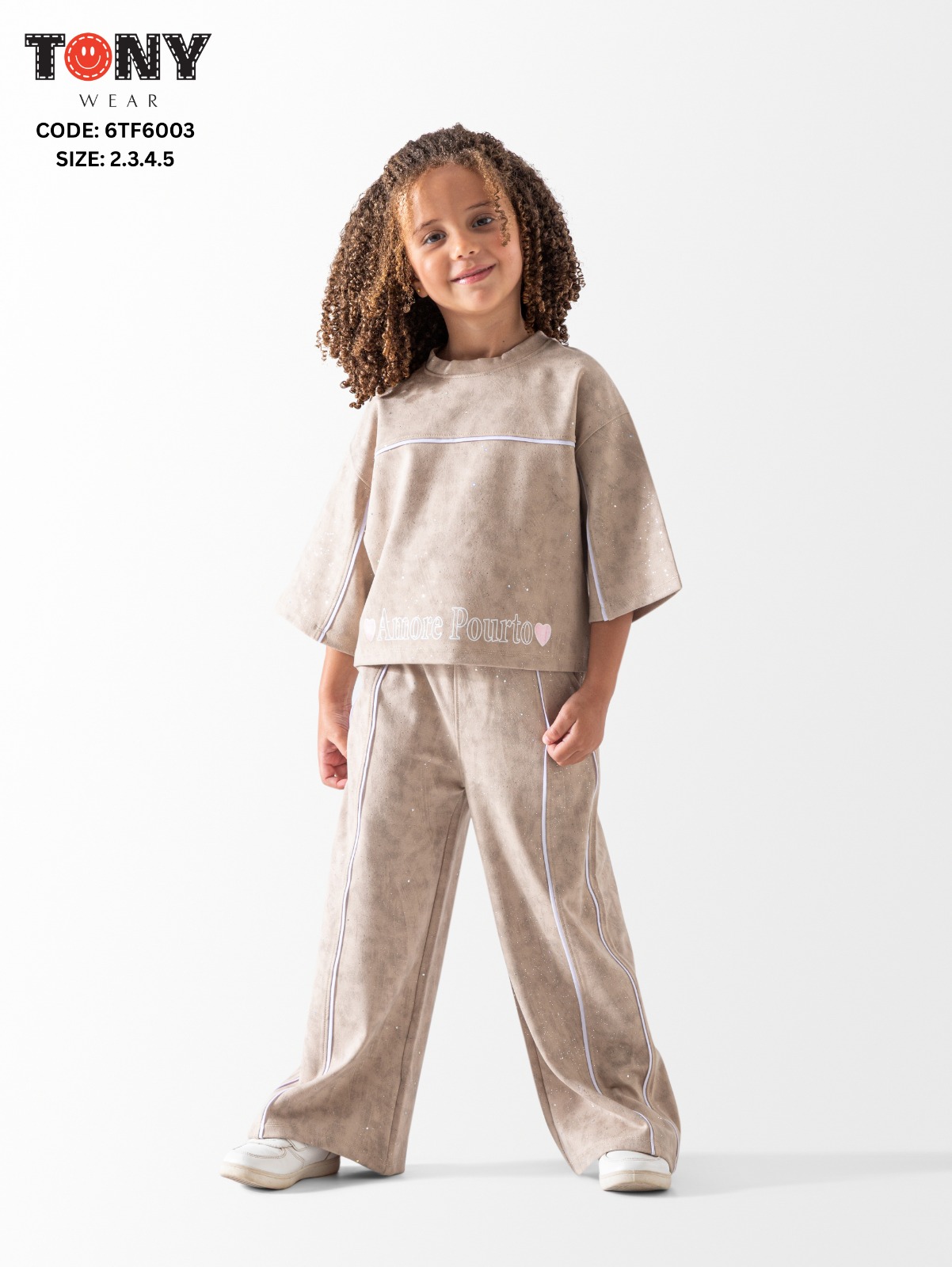 طقم بناتي أنيق مصنوع من خامة طبي سترس، مصمم بستايل مريح وواسع. مناسب للأطفال بعمر 2-5 سنوات.